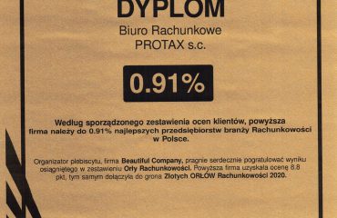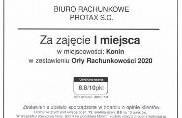 Jest nam niezmiernie miło poinformować, że BIURO RACHUNKOWE PROTAX S.C. zostało laureatem zestawienia „Orły Rachunkowości 2020„ zajmując 1-miejsce w rejonie Konińskim. Dodatkowo nasze biuro rachunkowe dołączyło do grona „Złotych ORŁÓW RACHUNKOWOŚCI 2020”